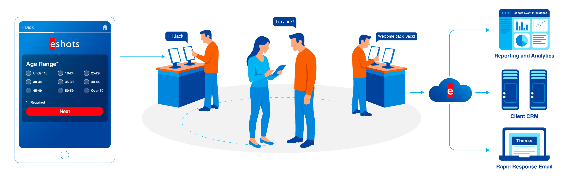 From saying hello to sending a targeted offer, QuickCapture helps brands turn registrants into customers. The QuickCapture app takes them down the survey path, which gets uploaded to the eshots cloud. From there, the profile is securely pushed to eshots' Event Intelligence platform and the brand's CRM. All of this is followed up with a Rapid Response email that can be customized based off of individual responses.